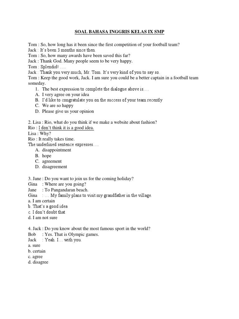 Ungkapan ini sering digunakan dalam percakapan bahasa Inggris dan biasanya satu paket penggunaan dengan giving an opinion memberi pendapat artinya setelah kita menyatakan persetujuan atau ketidaksetujuan akan sesuatu kita langsung menambahkannya dengan giving. Soal Ptsuts Bahasa Inggris Semester 1 Smpmts Kelas 9 Ix. Exercise Answer the following questions.