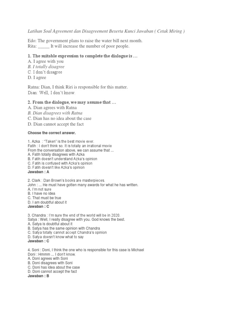 Soal agreement and disagreement. When producing language whether it be speaking or writing one of the most important language functions is that of agreeing and disagreeing. Uncertainty Soal UN SMPMTS 2003 2005 Postingan terkait. Share to Twitter Share to Facebook Share to Pinterest.