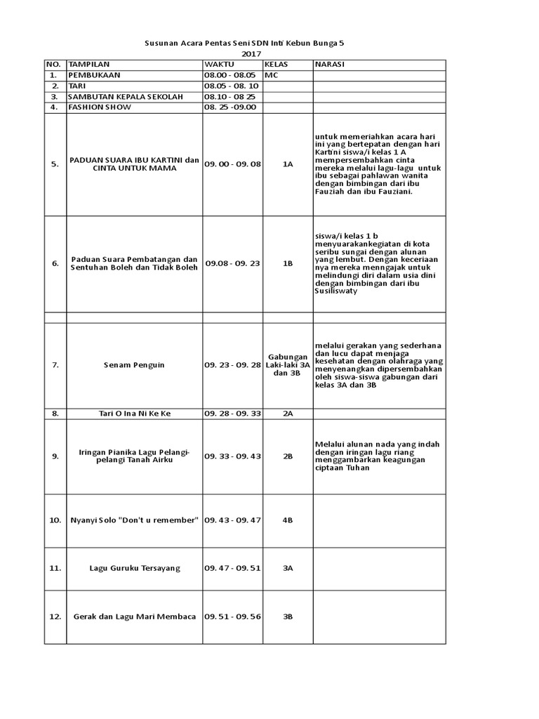 CONTOH RUNDOWN PENTAS SENI. Download Susunan Acara Pentas Seni Comments. Vokal group dari kelas XII IPS 2 7.